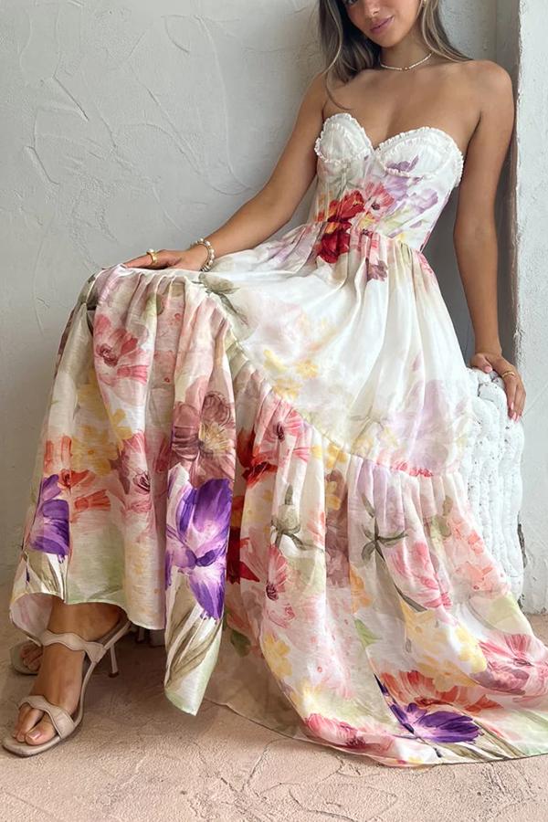 Romantic Date Floral Ruffle Detail Pocketed Corset Maxi Formal / Vacation Dress